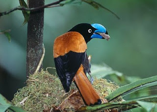 Helmet Vanga (Euryceros prevostii) is a distinctive-looking bird of the vanga family, Vangidae, and is classified in its own genus, Euryceros. It is mainly blue-black, with rufous wings and a huge arched blue bill. It is restricted to lowland and lower montane rainforests of northeastern Madagascar. Its diet is composed of invertebrates, predominantly insects.